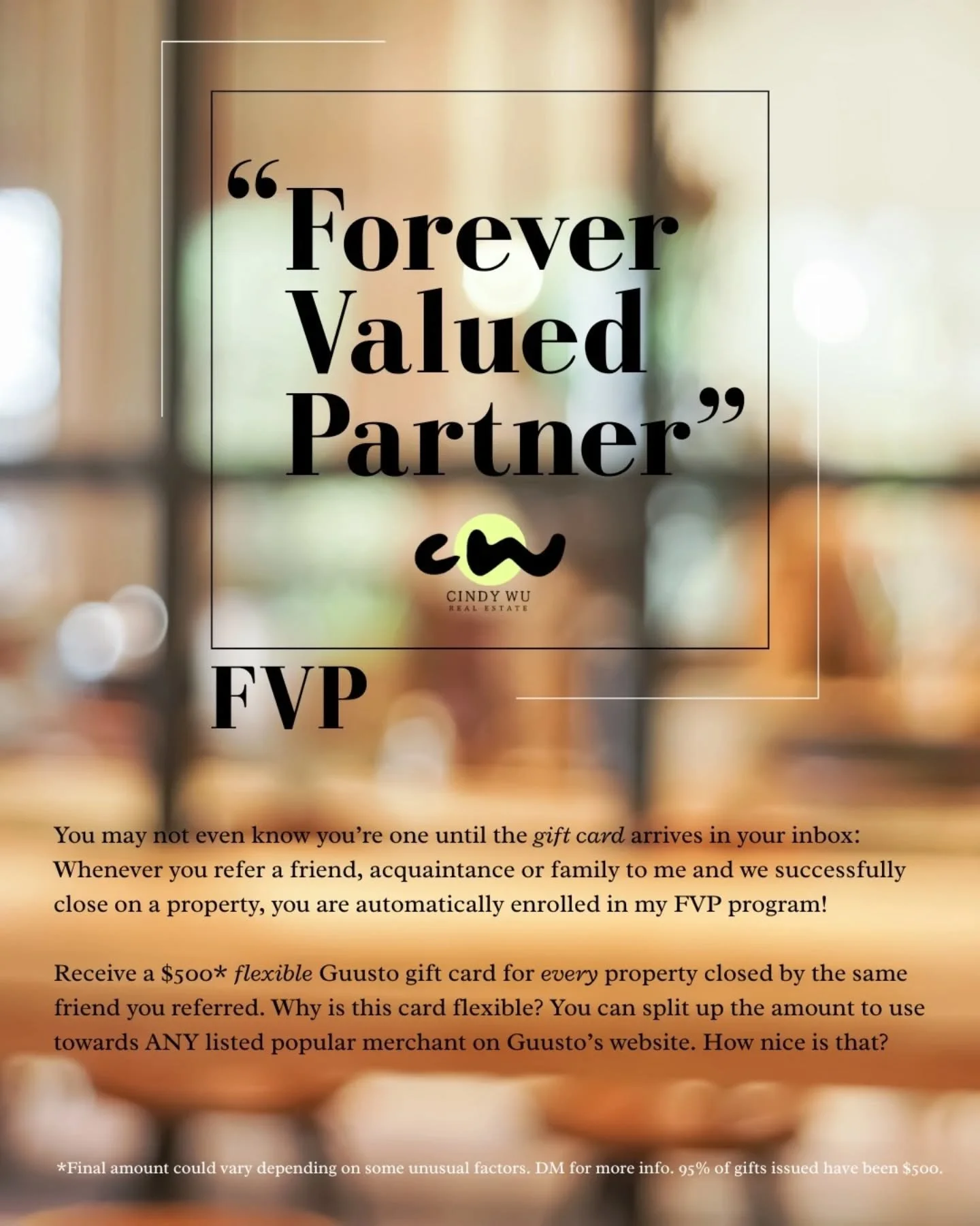 You will receive a $500 digital Guusto Gift Card from me upon a successful transaction with your referral!
